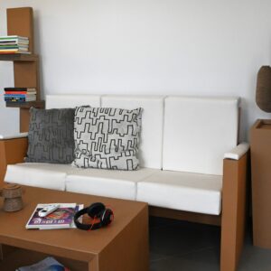 Il design del divano in cartone riciclato è studiato per offrire il massimo comfort e supporto. Nonostante la leggerezza del materiale, la struttura è estremamente robusta e resistente. I cuscini, realizzati con materiali ecologici, aggiungono un ulteriore livello di comfort, rendendo il divano perfetto per rilassarsi dopo una lunga giornata.